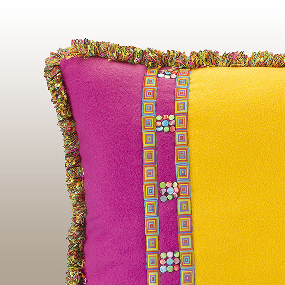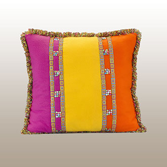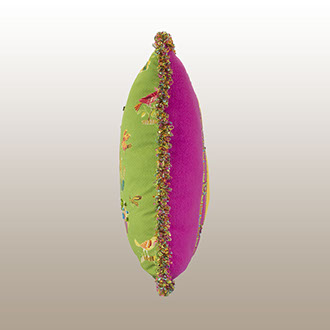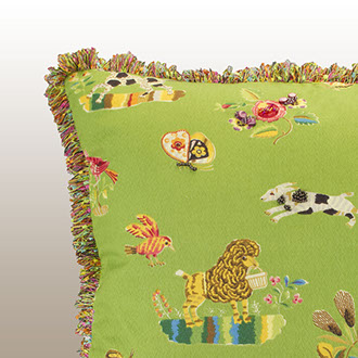This wonderful animal pattern was created for the Folk Art Museum in New Mexico by Brunschwig and Fils. It is a potpourri of nature’s wild life and colorful plants coming together on a woven lime green ground cloth. Hand applied beading is sporadically placed. The opposite side has three different colors of soft and cuddly fleece fabric with trim banding capturing many of the front panel colors. The edge trim also in the same colors gives a festive and whimsical look. Back design detail has small flat pearl rounds in three colors reflecting colors from the front panel. . Atelier for the home.
