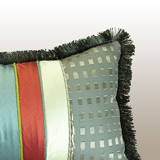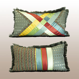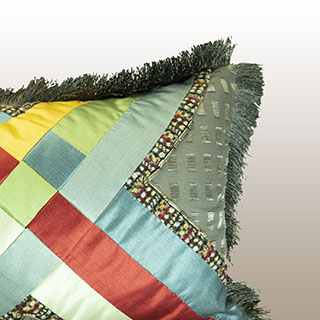 Upcycling or repurposing is a wonderful way to create a beautiful end product out of leftover fabrics, trims creating a one of a kind designer piece of art for your home. Bright primary colors from Beacon Hill are a focal point for the gray silk and textured woven designer fabrics to create a vibrant set of pillows for any seating area in your home