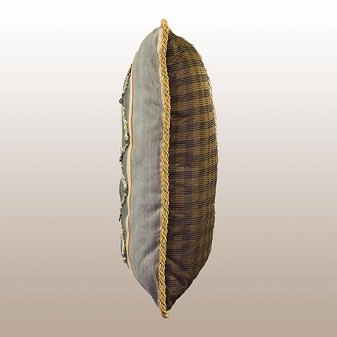Woven and hand painted silks with custom hand applied trim create this sophisticated pillow with neutral tones, textures and trimmings.