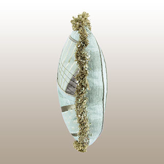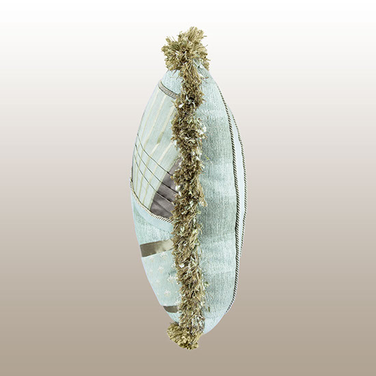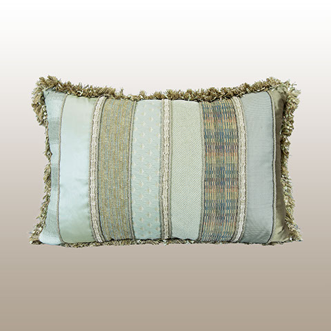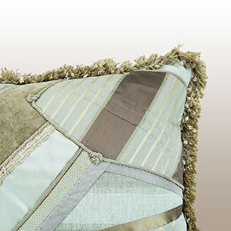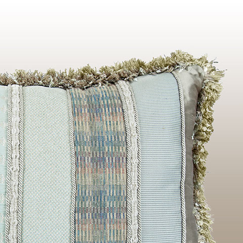 Upcycling or Repurposing uses various sizes and shapes of fabrics and trimmings to create a custom designed pillow work of art where each side is a uniquely designed. Nature’s colors of celadon and earth tones from fabric manufacturers such as Robert Allen, Bergamo, Jim Thompson, and Rose Cummings create many varied textures and patterns for each side of this one of a kind designer pillow.