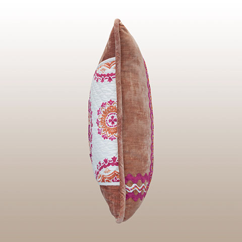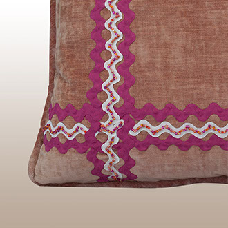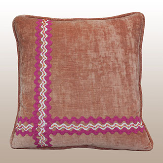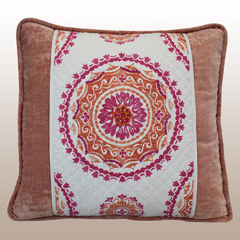 Robert Allen apricot chenille with hand applied designer trimmings plus a textured folk art quilted panel come together creating a custom fuschia and melon Folk Art pillow work of art!!