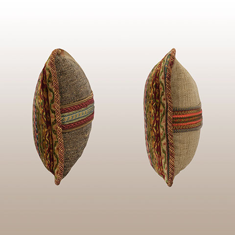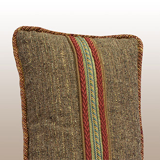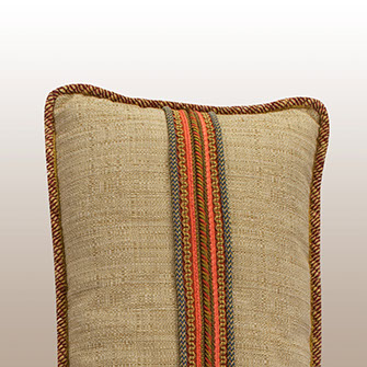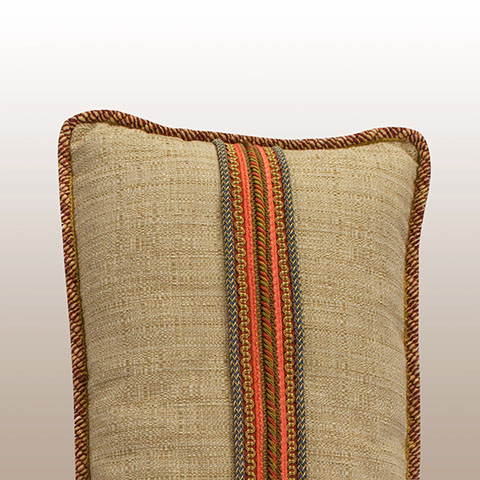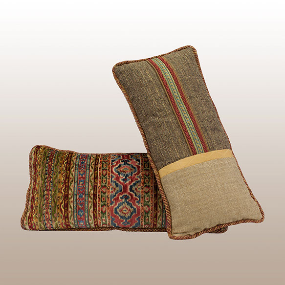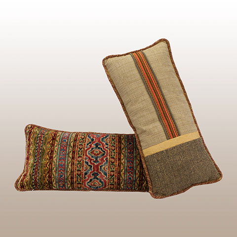 Smaller lumbar pillows are wonderful to cushion the back when sitting. This pair of specially designed pillows offer both a designer look and comfort. To create surprise, each back panel uses coordinating tones of the face fabrics plus a custom designed group of horizontal trims. Pillow Galleria… Atelier for the home.